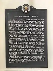 The museum's role in cultural growth was recognized as contributing to government's desire for national development.[7] In 1966, President Ferdinand Marcos signed Republic Act No. 4846 or the Cultural Properties and Protection Act. In 2013, President Noynoy Aquino launched the construction of the National Museum of Natural History, which opened in 2018. Aquino also backed the construction and development of several regional museums, including the museums in Batanes, Vigan, Marinduque, Bohol and Iloilo, among others, while supporting the heritage preservation projects of the National Museum, including the restoration of churches damaged by natural calamities, including churches in Cebu, Bohol, and Eastern Samar.[8] In 2019, President Rodrigo Duterte changed the agency's name from National Museum to National Museum of the Philippines through Republic Act No. 11333.[9]