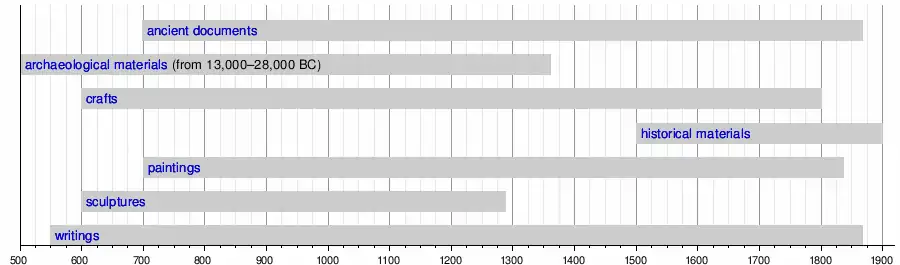 The designated items provide an overview of the history of Japanese art and architecture from ancient to modern times, with the earliest archaeological National Treasures dating back 6,500 years, and the Akasaka Palace dating from the early 20th century.[33][51][52][79] Items from any one of the categories of National Treasures may not represent the entire interval of time, but rather a shorter period of time determined by historical events, and coinciding with the time in which the specific artistry or type of architecture flourished.[28]