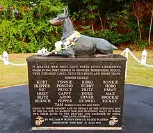 As the dogs died over the course of the battle, they were buried along with other Marines at Asan, the initial landing point of the invasion. White headstones were added later, forming a small plot in the cemetery. The human remains were eventually returned to the United States, and by the 1980s the dogs' graves had been largely forgotten and were overgrown with weeds.[6] William Putney, who had served as the commanding officer of the 3rd War Dog Platoon, lobbied for the creation of a memorial to the dogs and with the aid of the United Doberman Club, raised funds for the monument. The monument was unveiled at the Pentagon in June 1994 and became the first official war dog monument in the U.S. The remains and markers were moved to a new cemetery on the naval base in June 1994 created by a Seabee detachment from NMCB 1.The memorial was dedicated on July 21, 1994, the 50th anniversary of the battle.[7]