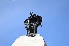 Two 5.33-metre-high (17.5 ft) allegories of peace and freedom stand at the apex of the arch, their proximity to each other representing the inseparability of the two concepts, though, the figure bearing a torch alludes in Roman mythology to Demeter and the winged figure with a laurel depicts Nike, the Greek goddesses of agriculture and victory, respectively.[12] Below are the depictions of 22 Canadian servicemembers from all branches of the forces and other groups engaged in the First World War. At the front, to the left, a Lewis gunner, to the right, a kilted infantryman with a Vickers machine gun. Following these are a pilot in full gear and an air mechanic of the Royal Canadian Air Force, as well as a sailor in the Royal Canadian Navy from HMCS Stadacona. Two mounted figures—a member of the Canadian Cavalry Brigade and a dispatch rider—are emerging from the arch, side by side, followed by two infantry riflemen pressing through the arch and behind them are the men and women of the support services, including two nurses from the Militia Army Medical Corps, a stretcher bearer, and one member each of the Royal Canadian Engineers and the Canadian Forestry Corps. The rear figures are pulling a QF 18-pounder gun. Further, there is one member each of the Canadian Army Service Corps, the Canadian Signals Corps, the Corps of Canadian Railway troops, the Royal Regiment of Canadian Artillery, and the Motor Machine Gun Corps. There are three additional infantrymen; all six carry among them respirators and other items of the "basic load" carried by every member of the infantry.[13][14]