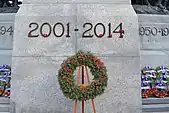 On 11 November 2014, the representation of the National War Memorial itself was also expanded to include those who served in the Second Boer War and the War in Afghanistan, and to "formally recognize all Canadians who served in the past, who serve today, and who will serve in the future."[81][82] In that respect, the dates "1899–1902" (of the Boer War) and "2001–2014" (covering Canadian involvement in the Afghan War) were added to the monument.