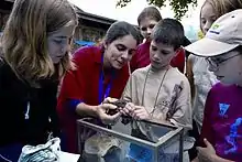Natur- und Tierpark Goldau runs a school inside the park where zoo pedagogues and park rangers offer workshops for school classes and guided tours for schools and visitor groups to the animals. The rangers offer for example commentated feedings of bears, cormorants and wild boars. They also work as informants for individual visitors doing a walkabout.