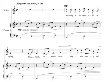 He is best known for his art songs, of which he wrote more than 500.[45][n 8] Many are coupled into some thirty or so song cycles, written from the early 1940s to 2000s.[17][n 9] Rorem stressed the importance of a cycle's overall structure, paying close attention to the song order, progression of keys and transition between songs.[48] He also emphasized theatricality, aiming to convey an overarching message via a unified emotional affect or mood.[49] Like in other genres, the musicologist Philip Lieson Miller remarked that "Rorem's chosen field of song is not for the avant garde and he must be classified as [...] conservative", and that "he has never striven for novelty".[50] Rorem's strict definitions of what constitutes a song has molded them to be typically be single-voice and piano settings of lyrical poems of moderate length.[51] He named songs by Monteverdi, Schumann, Poulenc and the Beatles as particular favorites.[5] To obtain certain effects, however, Rorem has occasionally experimented with more modernist sentiments, such as intense chromaticism, successive modulations and alternating time signatures.[52]