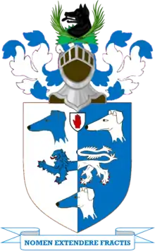 | Arms | Per pale Argent and Azure a lion passant between three greyhounds' heads erased and Counterchanged. |