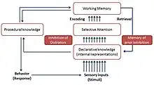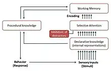 Distractor inhibition model is the oldest model that explains the negative priming effect as the result of selective attention to a target stimulus. When we pay attention to a particular stimulus, we perceive other stimuli surrounding the target as distractors in order to help focus. But when one of those distractors becomes the new target of attention, our response to the target is hampered due to immediate residual inhibition.[5][6] Selective attention is the ability to respond to a specific object when there are other distractors that also compete for a response. To explain this selective attention, the distractor inhibition model proposes a dual mechanism involving excitation to boost target signal and inhibition to suppress distractors. This inhibition is triggered when there is a mismatch between the internal representations of the target and a distractor. Inhibition of the distractor's internal representation is a way of helping to selectively attend to the target stimulus. This inhibition decays gradually when the stimulus is no longer present to help with the next target. However, if a distractor stimulus is re-encountered as the target, the internal representation of the distractor stimulus may continue to be suppressed because it is too soon for the decay to dissipate already. This is referred to as the transient residual inhibition. This inhibition also impairs the processing of an appropriate response to the new target stimulus and results in greater reaction time.[5][7]