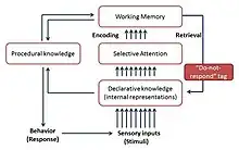 Broadly, negative priming is also known as the mechanism by which inhibitory control is applied to cognition. This refers only to the inhibition stimuli that can interfere with the current short-term goal of creating a response.[3] The effectiveness of inhibiting the interferences depends on the cognitive control mechanism as a higher number of distractors yields higher load on working memory. Increased load on working memory can in turn result in slower perceptual processing leading to delayed reaction. Therefore, negative priming effect depends on the amount of distractors, effectiveness of the cognitive control mechanism and the availability of the cognitive control resources.[4]