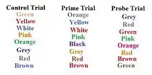 The primary two stimulus modalities used for negative priming research are visual and auditory stimulus materials. The stimulus presented varied from objects or symbols in visual field to human voices or artificial sounds. Stronger negative priming effects are found for auditory stimulus but the standardized effect sizes between the modalities did not vary.[1] Evidence for negative priming has also been found across various modes of response including vocal naming, manual key press, and reaching.[3] Negative priming was observed for various types of judgment such as identification, categorization, matching, counting and localization. The tasks used to find evidence for negative priming includes Stroop color–word task, lexical decision task, identification, matching, and localization tasks. The Stroop color–word task utilizes the Stroop effect to observe the distractor suppression and negative priming. Identification tasks present a set of images, sounds, words, symbols, or letters and require the subject to select the prime target based a particular feature that differentiates the target from the distractor. Lexical decision utilizes semantic knowledge of the subject and tests the subject ability to remember the multiple meanings and uses of one word. For example, the word "bank" has multiple meanings and can be referred in different contexts such as "bank is a place where money is deposited" or "banks of a river".[3] Matching tasks require subjects to respond "same" or "different" by matching the target letters or shapes with the explicitly specified goal while ignoring the distractor. Localization tasks require some form of movement of subjects to respond to the location of the target stimulus.[12] This type of localization task is especially used to test the feature mismatch hypothesis as it provides evidence for negative priming during the mismatch of the location and target stimuli.