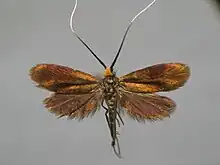 The wingspan is 10–11 millimetres (0.39–0.43 in).[3] Adults have uniformly dark brown forewings with an oily tint, They are on wing in July.