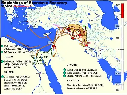 After Adad-nirari's death in 783 BC, three of his sons ruled in succession: Shalmaneser IV (r. 783–773 BC), Ashur-dan III (r. 773–755 BC) and Ashur-nirari V (r. 755–745 BC). Their reigns collectively form what appears to be the low point of Assyrian royal power since a remarkably small number of royal inscriptions are known from them. In Shalmaneser IV's reign, Shamshi-ilu eventually grew bold enough to stop crediting the king at all in his inscriptions and instead claimed to act completely on his own, more openly flaunting his power. Probably under Shamshi-ilu's leadership, the Assyrian army began to mainly focus on Urartu. In 774 BC, Shamshi-ilu scored an important victory against Argishti I of Urartu,[59] though Urartu was not decisively beaten.[60] There was however some significant successes in the west[60] since Shamshi-ilu captured Damascus in 773 BC and secured tribute from the city to the king.[59] Another official who acted with usually royal privileges in Shalmaneser's time was the palace herald Bel-harran-beli-usur, who founded a city, Dur-Bel-harran-beli-usur (named after himself), and claimed in a stele that it was he, and not the king, who had established tax exemptions for the city.[59] Though little information survives concerning Ashur-dan III's reign, it is clear that it was particularly difficult. Much of his reign was spent putting down revolts. These revolts were perhaps the result of the plague epidemics sweeping Assyria and the Bur-Sagale solar eclipse on 15 June 763 BC; both the epidemics and the eclipse could have been interpreted by the Assyrian populace as the gods withdrawing their divine support for Ashur-dan's rule.[61] Though Assyria stabilized again under Ashur-dan's brother Ashur-nirari V,[62] he appears to have been relatively idle. Ashur-nirari campaigned in only three of the ten years of his reign and is not recorded to have conducted any construction projects.[63] The influential Shamshi-ilu died at some point in Ashur-nirari's reign. Though the Assyrian army under Ashur-nirari was successful against Arpad in northewestern Syria in 754 BC, they were also beaten at an important battle against Sarduri II of Urartu.[62]