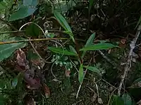 Leaves are sessile and coriaceous.[2] The lamina is lanceolate-spathulate in form. It may be up to 10 cm long and 2 cm wide. It has an acute apex and is gradually attenuate towards the base, which clasps the stem for one third to a half of its circumference.[2] Around three pairs of longitudinal veins are present on the lamina, originating from the basal third of the midrib. Pinnate veins are oblique and irregularly reticulate, although they are not easily distinguishable.[2] Tendrils can be up to 15 cm long and may or may not have a curl.[8]