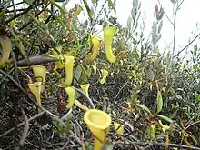 In its natural habitat, N. dubia is sympatric with N. gymnamphora, N. izumiae, N. jamban, and N. lingulata.[8][12] The stunted upper montane forest which these species inhabit is dominated by ferns of the genera Dipteris and Dicranopteris. Trees rarely exceed 3 m in height and few Nepenthes plants emerge above the vegetation.[8]