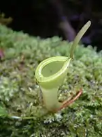 Upper pitchers are generally larger, growing to 8 cm in height and 4 cm in width. They gradually arise from the ends of the tendrils, forming a 5 to 10 mm wide curve.[2] They are tubular to infundibular in the lower parts with laterally appressed pitcher walls. As in N. inermis, there is almost no gap between the walls in mature pitchers. The upper part of the pitcher is widely infundibular throughout. Wings are reduced to ribs in upper pitchers. The inner surface of the pitcher is covered with numerous small, slightly depressed glands, occurring at a density of 600-900 per square centimetre;[2] it lacks a waxy zone.[10] The pitcher mouth is ovate, horizontal, and acute towards the lid.[2] It bears a cylindrical or involute peristome (≤4 mm wide) with indistinct teeth spaced 0.25 to 0.5 mm apart.[2] The inner portion of the peristome accounts for around 45% of its total cross-sectional surface length.[10] The lid is narrowly cuneate, without appendages, and up to 4 cm long and 0.7 cm wide. It is rounded at the apex, gradually attenuate towards the base, and bears numerous small round or elliptical glands on its undersurface.[2] Characteristically, it is almost always reflexed beyond 180 degrees relative to the pitcher mouth.[8] In upper pitchers, the unbranched spur is 3 to 5 mm long.[2]