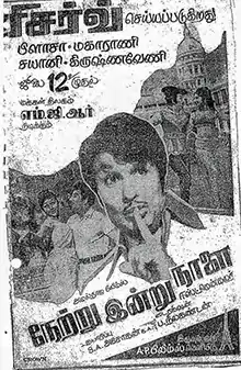 Netru Indru Naalai (transl.Yesterday, Today, Tomorrow) is a 1974 Indian Tamil-language film directed by P. Neelakantan. The film stars M. G. Ramachandran Manjula and Latha. It was released on 12 July 1974, and ran for 150 days in theatres.