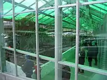 Neukom Vivarium is a mixed media installation by American artist Mark Dion, located at Olympic Sculpture Park in Seattle, Washington. The work's design was approved in 2004 and completed in 2006. The Seattle Art Museum, which operates the park, described Neukom Vivarium as a "hybrid work of sculpture, architecture, environmental education and horticulture that connects art and science."[2] It features a 60-foot (18 m) nurse log, formerly part of a forest ecosystem that now "inhabits an art system", housed within an 80-foot (24 m) greenhouse.[2] The greenhouse includes a cabinet designed by Dion that supplies magnifying glasses, allowing visitors to inspect the log for various life forms. Field guides are present in the form of blue and white tiles, depicting bacteria, fungi, insects, lichen and plants that may be found on the log.[2]