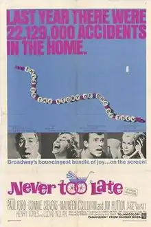 Never Too Late is a 1965 comedic feature film directed by Bud Yorkin and produced by Norman Lear. It stars 54-year-old Maureen O'Sullivan as the wife of a businessman (played by 64-year old Paul Ford) who discovers, after 25 years of marriage, that she is to become a mother for the second time. Adding to the complications is the fact that their married daughter (Connie Stevens) and her husband (Jim Hutton) live with them.[2]