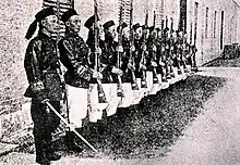 The New Army (Traditional Chinese: 新軍, Simplified Chinese: 新军; Pinyin: Xīnjūn, Manchu: Ice cooha), more fully called the Newly Created Army ( Xinjian Lujun[lower-alpha 1][lower-alpha 2]), was the modernised army corps formed under the Qing dynasty in December 1895, following its defeat in the First Sino-Japanese War. It was envisioned as a regular and professional fully trained and equipped according to Western standards with a reserve. In 1903 an imperial edict expanded it to 36 divisions of 12,500 men each, or total of 450,000 in peacetime supplemented by a further 523,000 reservists in wartime though it never achieved a strength above 300,000.[1][2][3]