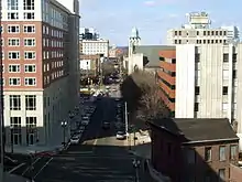 The six-story First Reformed Church, built in 1812 was long the city's tallest structure.[85] One of the earliest tall commercial buildings in the city was the eight-story 112.5 ft (34.29 m) National Bank of New Jersey built in 1908.[86][87] The 4 nine-story 125 ft (38 m) buildings of the New Brunswick Homes housing project, originally built in 1958, were demolished by implosion in 2000 and largely replaced by low-rise housing.[88][89][90]