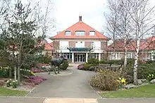 There is a local community centre, the Folk Hall, which hosts activities such as keep-fit, yoga, snooker, and a junior youth club. New Earswick has recreational facilities, including a swimming pool currently run by a charitable organisation, the Friends of New Earswick Swimming Pool, tennis courts and football, rugby and cricket pitches at the New Earswick Sports and Social Club. There were two open access play areas close to the Folk Hall, including a hard surface play area which have recently been bulldozed for a development of houses. There is a library based in the Integrated Children's Centre at the local primary school, a doctor's surgery and a range of shops, including two general stores, a pet shop and Post Office.[7] As of 2017 the Post Office is situated within the Folk Hall.