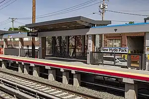 In 1947, the station house was rebuilt again with a smaller and less elaborate brick structure, and relocated along the westbound tracks, with a matching brick open shelter along the eastbound tracks. Sometime during the 1960s, high-level platforms were added to the station, with a white stucco wall between the platforms and station house containing a blue sign with white lettering reading "LONG ISLAND RAIL ROAD" on top and "NEW HYDE PARK VILLAGE" on the bottom.[7] This was replaced between 2002 and 2003 with the retro-classic structure seen today.[8]