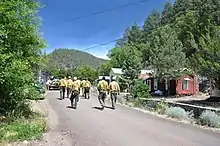 Firefighters walking east on NM 159 in Mogollon, during the Whitewater–Baldy complex Fire, June 2012