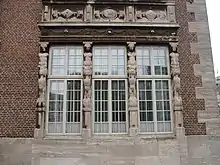 The façades are also decorated with various figures and ornaments such as four children playing with domestic animals, the staff of Mercury, the trident of Neptune for trade and shipping, two playing angels on the Domshof architrave, squirrels nibbling at the national property, a lion killing a basilisk, several lions with rings in their mouths, one with the key from the Bremen coat of arms, several other animals, a siren tempting sailors and a man with a shield.[3] The oriel of the mayor's room on the Grasmarkt side is decorated with four sculptures symbolising the cycle of the day: a young woman for the morning, a young man with a work tool for noon, an old man playing an instrument for the evening and an old woman, ready to retire for the night. To the left, there is a symbol for trade, a crocodile and a snail to symbolise the need to be wary when trading. Below the proclamation window, there are two stone medallions: Till Eulenspiegel and a lion.