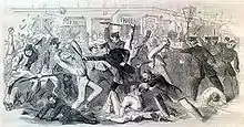 Throughout the years, the NYPD has been involved with a number of riots in New York City. In July 1863, the New York State Militias were aiding Union Army troops in Pennsylvania, when the 1863 New York Draft Riots broke out. Their absence left it to the police — who were then outnumbered — to quell the riots.[9] The Tompkins Square Riot occurred on January 13, 1874 when police crushed a demonstration involving thousands of unemployed in Tompkins Square Park.[10]
