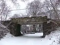 Service past Grassland station ended in 1963 due to the deterioration of the bridges past that point and all service on the line ceased by 1981. Conrail obtained permission to abandon the line in 1982 and removed the tracks and bridges in 1985.[3] The roadbed remains intact, though largely overgrown with weeds and trees. In some cases, private business has obliterated portions of the line. Several areas of the roadbed are accessible to the public, mainly in Naylor Run Park in Upper Darby Township.
