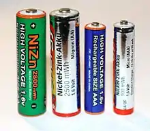 ![]() Nickel–zinc cells in AA and AAA sizes | |