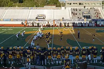 The Texas A&M–Commerce Lions in a nickel defense against the Adams State Grizzlies in 2015