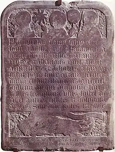 Flamel lived into his 80s, and in 1410 designed his own tombstone, which was carved with the images of Jesus Christ, Saint Peter and Saint Paul. The tombstone is preserved at the Musée de Cluny in Paris. Records show that Flamel died in 1418.[4] He was buried in Paris at the end of the nave of the former Church of Saint-Jacques-de-la-Boucherie.[5] His will, dated 22 November 1416, indicates that he was generous but that he did not have the extraordinary wealth of later alchemical legend. There is no indication that the real Flamel of history was involved in alchemy, pharmacy or medicine.[2]
