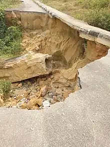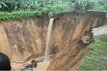 Gully erosions occur due to sandy soil being unable to withstand the runoff and eventually eroding away, leaving gaping gullies that swallow homes and other infrastructure. Gullies and areas exposed to erosion in South Eastern Nigeria tripled from about 1.33% (1,021 km2) in 1976 to about 3.7% (2,820 km2) in 2006, making the region the most affected in the country.[2][3]