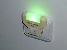 A nightlight is a small light fixture, usually electrical, placed for comfort or convenience in dark areas or areas that may become dark at certain times, such as at night or during an emergency. Small long-burning candles serving a similar function are referred to as "tealights".