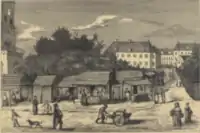 In 1810,the butchers on Højbro Plads received permission to move their market stalls to the site of the former graveyard. Especially on warm days, the market activities resulted in a foul odor and the conditions were described as a potential health threat in 1818.[1] The architect Christian Frederik Hansen made a proposal for a market building on the square in the 1820s but it was not realized. In 1842, the number of market stalls had grown to 82. The debate about better conditions for the market trade resurged and a complex of market building design by Peter Heinrich Christoph Hagemann was built in 1834–46. It was made of cast iron and contained 68 large and 10 small shops.[3] The market stalls ran along the streets Lille Kongensgade, Nikolajgade, Vingårdsstræde and Admiralgade.