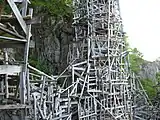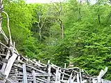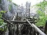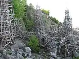 Nimis (from the latin, "too much") is a site-specific artwork by Lars Vilks located at Håle stenar in the north western region of Skåne, Sweden, in the declared micronation Ladonia. The artwork mostly consists of wooden constructions erected of driftwood, planks and branches. The work is illegally placed in Kullaberg, which has led to an ongoing legal process between the artist and the Skåne County administrative board. Parts of the artwork have been set on fire on different occasions, and it was rebuilt after a fire in 2016 by Ladonia's Art and Jumping Minister, Fredrik Larsson.[1] Which led to a fine being issued in 2018 by a district court.