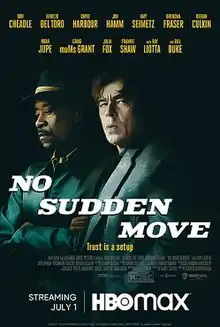 No Sudden Move is a 2021 American crime thriller film directed by Steven Soderbergh, produced by Casey Silver, and written by Ed Solomon. The film features an ensemble cast including Don Cheadle, Benicio del Toro, David Harbour, Jon Hamm, Amy Seimetz, Brendan Fraser, Kieran Culkin, Noah Jupe, Craig muMs Grant (in his final appearance), Julia Fox, Frankie Shaw, Ray Liotta, and Bill Duke.