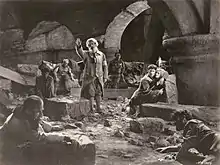 7,500 extras worked on the film.[4] During the filming of the climactic flood scene, the 600,000 US gallons (2,300,000 L; 500,000 imp gal) of water used was so overwhelming that three extras drowned, one was so badly injured that his leg needed to be amputated, and a number suffered broken limbs and other serious injuries, which led to implementation of stunt safety regulations the following year.[5] Dolores Costello caught a severe case of pneumonia. Thirty-five ambulances attended the wounded.[6]