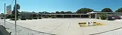 The pavilion was designed by architect Jack West, a member of the Sarasota School of Architecture, and is an example of minimalist architecture associated with mid-century modern architecture. It was constructed in 1954 and includes an open pavilion connected by a covered walkway to a building for restrooms, changing rooms, and showers. There was also paved plaza, fountain, and landscaped area. Design elements include flat thin roofs on multiple planes, ribbon windows, and a blending of interior and exterior spaces. The bathhouse is made of Ocala block.[2]