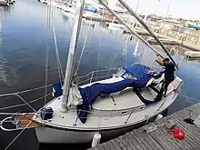 The wishbone boom fulfills the role of a traditional boom and vang, as the angled wishbone cane be tensioned downwards to maintain sail shape when sailing downwind. The wishbone boom also provides additional head clearance for the crew.[5]