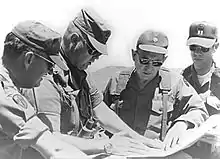 In the Vietnam War, Schwarzkopf served as a task force adviser to the Army of the Republic of Vietnam Airborne Division.[20][41] He was promoted to major shortly after arriving in Vietnam. After an initial orientation at Military Assistance Command, Vietnam (MACV), headquartered in Saigon, Schwarzkopf was sent north to Pleiku in the central highlands, in the II Corps Tactical Zone.[42] He got his first combat experience on August 3, when he was the senior adviser to a force of 1,000 South Vietnamese paratroopers sent to relieve a beleaguered South Vietnamese Army force at Đức Cơ Camp. The paratroopers took heavy casualties and a second, larger force was required to relieve them. That force too came into heavy contact. Schwarzkopf and his group fought continuously for several days. At one point, he braved heavy North Vietnamese fire to recover and treat a handful of wounded South Vietnamese soldiers and escort them to safety.[43]
