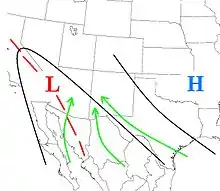 In early summer, the monsoon starts with a shift in wind patterns as Mexico and the southwest U.S. warm under intense solar heating.[4] The prevailing winds start to flow from somewhat cooler moist ocean areas into hotter, dry land areas.[3] Precipitation increases in late May to early June in southern Mexico and spreads along the western slopes of the Sierra Madre Occidental, reaching New Mexico and southeast Arizona and in early July. It extends into the southwest United States as it matures in mid-July, when an area of high pressure, called the monsoon or subtropical ridge, develops in the upper atmosphere over the Four Corners region, creating wind flow aloft from the east or southeast.[5] At the same time, a thermal low (a trough of low pressure from intense surface heating) develops over the Mexican Plateau and the Desert Southwest of the United States.[6]