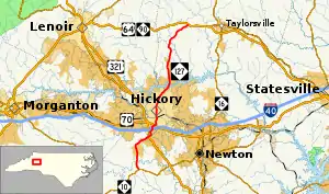 Established as a renumbering of NC 96 in 1940; the overall routing has not changed, but has changed roads through Hickory several times.[2]