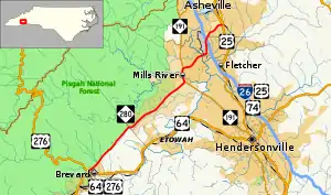 North Carolina Highway 280 (NC 280) is a primary state highway in the U.S. state of North Carolina that runs from the city of Brevard in Transylvania County to the town of Fletcher in Henderson County. It is 18 miles (29 km) in length, starting at the intersection with US 64 and US 276 north of Brevard to US 25 and US 25A in the Asheville community of Arden.