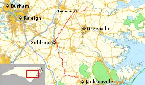 North Carolina Highway 111 (NC 111) is a 126.0-mile-long (202.8 km) primary state highway in the U.S. state of North Carolina. Traveling northsouth through Eastern North Carolina, it connects the various rural towns and communities with the cities of Jacksonville (via U.S. Route 258 (US 258) and NC 24), Goldsboro and Tarboro.