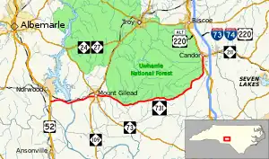 NC 731 is a two-lane rural highway that traverses 25.9 miles (41.7 km). Beginning at U.S. Route 52 (US 52) south of Norwood, it goes west crossing the Pee Dee River and through Mount Gilead. In Mount Gilead, NC 731 intersects NC 109 and NC 73 and has a concurrency with the unsigned NC 109 Business (NC 109 Bus.). Forming the southern boundary of the Uwharrie National Forest, it continues a northwesterly direction, linking up with US 220 Alternate (US 220 Alt.) as it enters Candor. At the center of Candor, NC 731 ends, connecting with NC 211 and US 220 Alt. continuing north to Biscoe.[1]