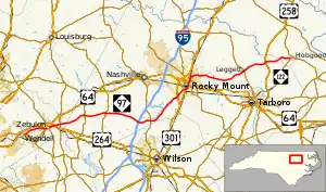 North Carolina Highway 95 (NC 95) was established in 1930 as a new primary routing from NC 40 in Rocky Mount to NC 12 in Lawrence.[16] In 1933, NC 95 was extended south along US 301/NC 40 through Rocky Mount, then west on new routing to US 64/US 264/NC 39/NC 90/NC 91 in Zebulon. In 1935, NC 95 was extended east to NC 122 near Hobgood.[17] In 1961, because of the establishment of I-95, NC 95 was renumbered as NC 97.