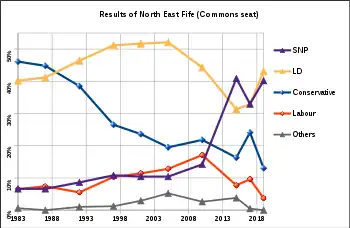 North East Fife was notable in several respects in the 2019 general election: it was the SNP's only loss of the election,[4] had the largest decrease in vote share for the Conservative Party (after the special case of Chorley, where the party did not stand) and also had the smallest Labour share of the vote in the United Kingdom, at 3.7% (again excluding Chorley, where the party did not stand).[5] The seat went from the most marginal seat at the 2017 general election to the fortieth most marginal in 2019 (measured by percentage majority).[6] When measured by absolute majority, North East Fife was the second most marginal Lib Dem-held seat at the election (after Caithness, Sutherland and Easter Ross).[7]