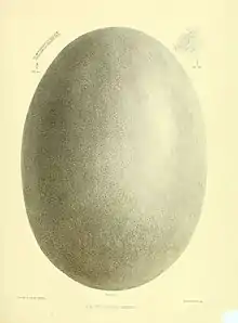 Whole moa eggs are a rare find in archaeology,[17]: 16201 however the abundance of fragments suggest that when fresh, the egg of the Dinornis novaezealandiae is estimated to have weighed over 3 kg and 190 x 150mm.[6] There is a single, largely intact egg (197 x 151 mm) attributed to this species, from a rock shelter in the Mangawhitikau Valley, Waitomo. [18] Ancient DNA results reveal that surfaces of the outer shell of eggs that belonged to Dinornis novaezealandiae yielded DNA from males only.[17]: 16203 This indicates that the males were the likely incubators of eggs.[17]: 16203 Findings also show that the inside of these eggs, and the remains on the outer surface, matched female DNA, which is thought to be from the egg laying process.[17]: 16203 The eggs of Dinornis have also been shown to be more susceptible to breakage than any of the 3,434 avian species measured to date.[17]: 16204 Though the male D. novaezealandiae were lighter than females, questions have been raised as to how birds of such weight, even those that were smaller, could manage to incubate the fragile eggs successfully since the possibility of breakage is many times greater than that of any other bird.[17]: 16204 For this reason, it is unlikely that larger moa, such as the D. novaezealandiae, would have been able to incubate their eggs using the same contact method that is practiced by almost all birds.[17]: 16204 Whilst the exact structure remains unclear, it is more likely they would have formed a special nest that would support their body weight in some way.[17]: 16204