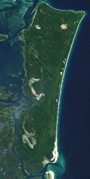 At 275.2 square kilometres (106.3 sq mi; 68,000 acres), it is the second largest sand island in the world.[8] On the island there are three small towns, a number of lakes and beaches along most of the seaward coastline with rocky outcrops at Point Lookout. An Aboriginal presence on the island has been long and ongoing, resulting in a successful native title determination. Tourism is a major and growing industry on the island.[9] The island has been the site for sand mining for more than sixty years. Tourism and currently mining are the island's main industries.