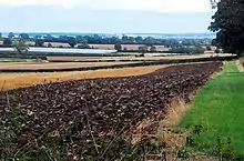 Ploughed fields in Wheatley, with strawberry polytunnels in background