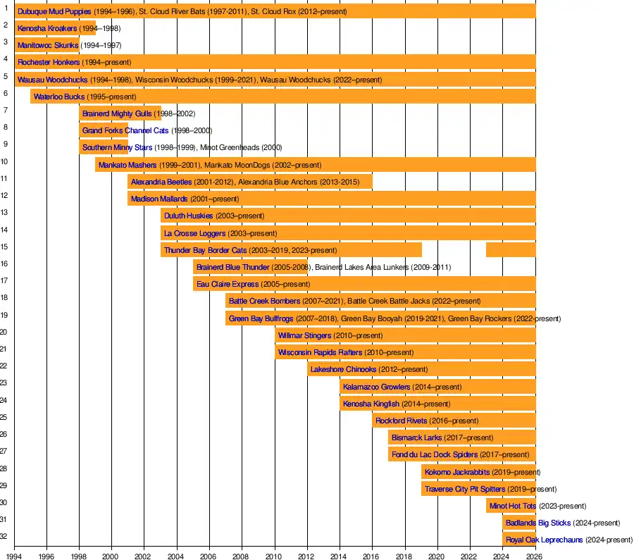 Minot Hot TotsTraverse City Pit SpittersKokomo JackrabbitsFond du Lac Dock SpidersBismarck LarksRockford RivetsKenosha KingfishKalamazoo GrowlersLakeshore ChinooksWisconsin Rapids RaftersWillmar StingersGreen Bay RockersBattle Creek BombersEau Claire ExpressBrainerd Blue ThunderThunder Bay Border CatsLa Crosse LoggersDuluth HuskiesMadison MallardsAlexandria BeetlesMankato MashersWaterloo BucksWausau WoodchucksRochester HonkersSt. Cloud Rox (collegiate summer baseball)